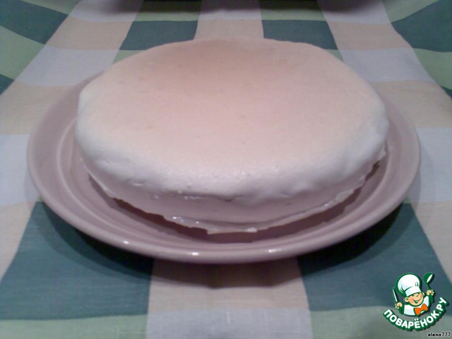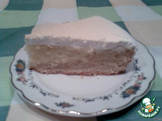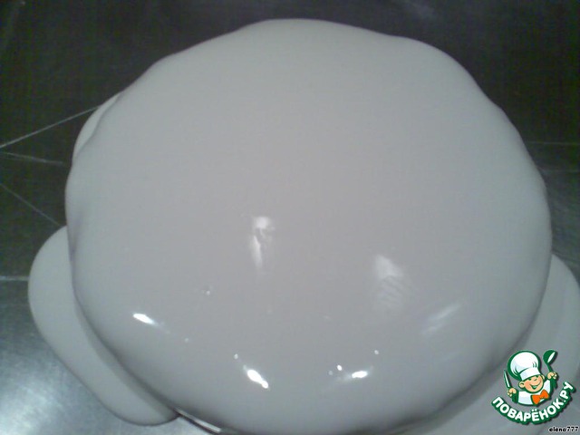 По истечении времени вынимаем тортик из формы на противень, мне пришлось аккуратно вынимать, так как форма не разъёмная. Заливаем белковой глазурью так, чтобы облились и бока (если немного стечёт на противень - ничего страшного, после запекания глазурь убрать ножом и скушать). 3 белка взбить, постепенно добавляя сахарную пудру и 1 ч.л лимонного сока.