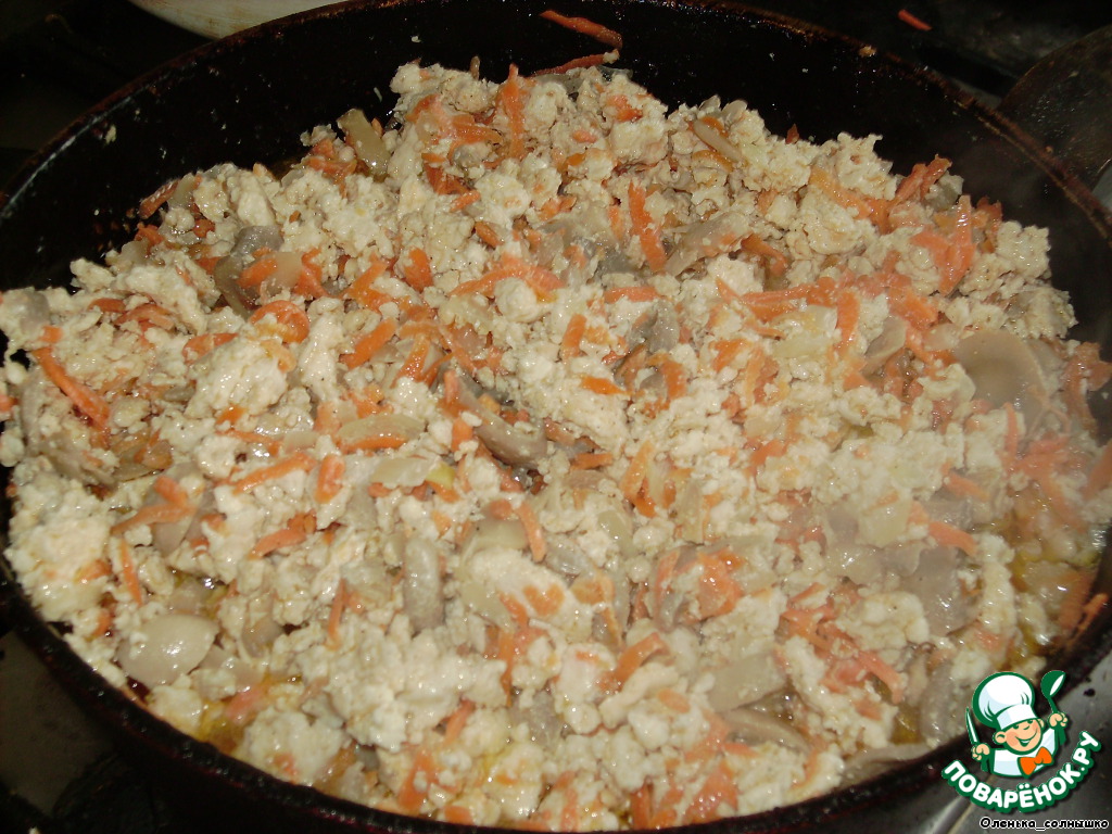 Пока тесто подходит, займемся начинкой: на разогретую с растительным маслом сковороду выкладываем фарш, натертую на крупной терке морковь, нарезанный кубиками лук, грибы