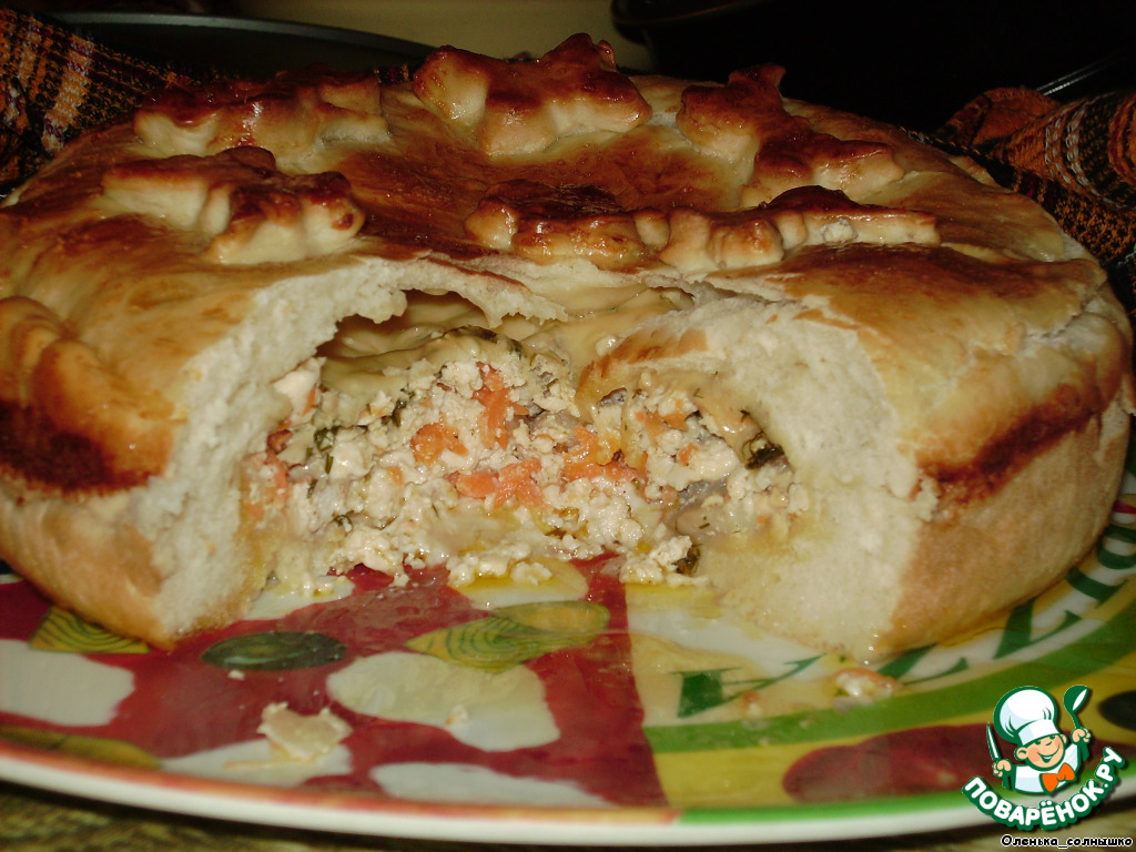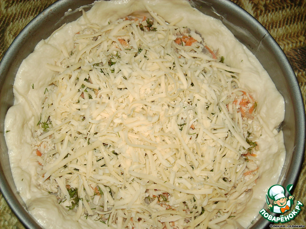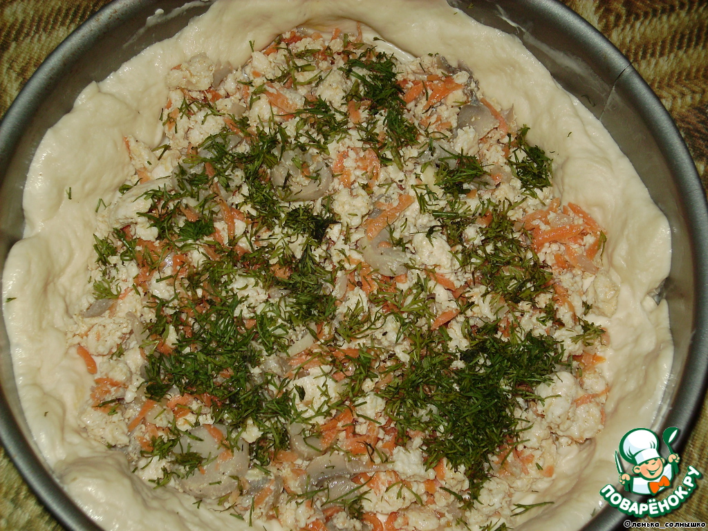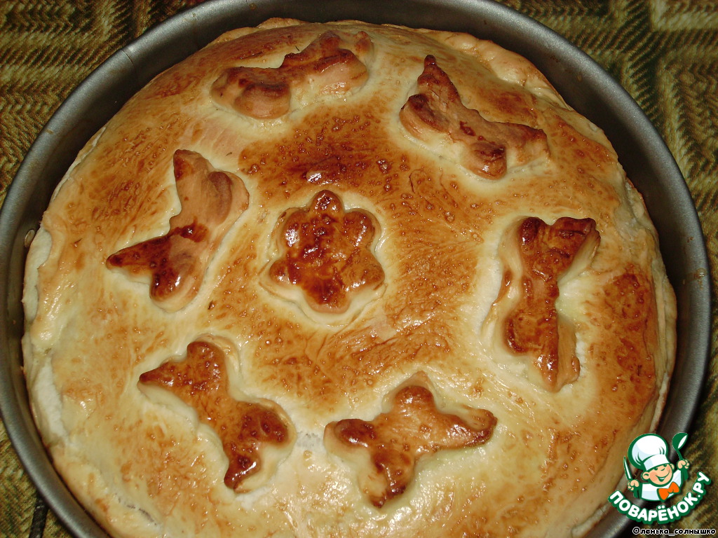 Раскатываем вторую часть теста, накрываем начинку, защипываем края