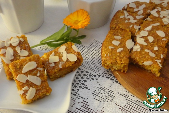 Остывший пирог вынуть из формы, нарезать на порционные кусочки, полить сиропом, присыпать миндалем.