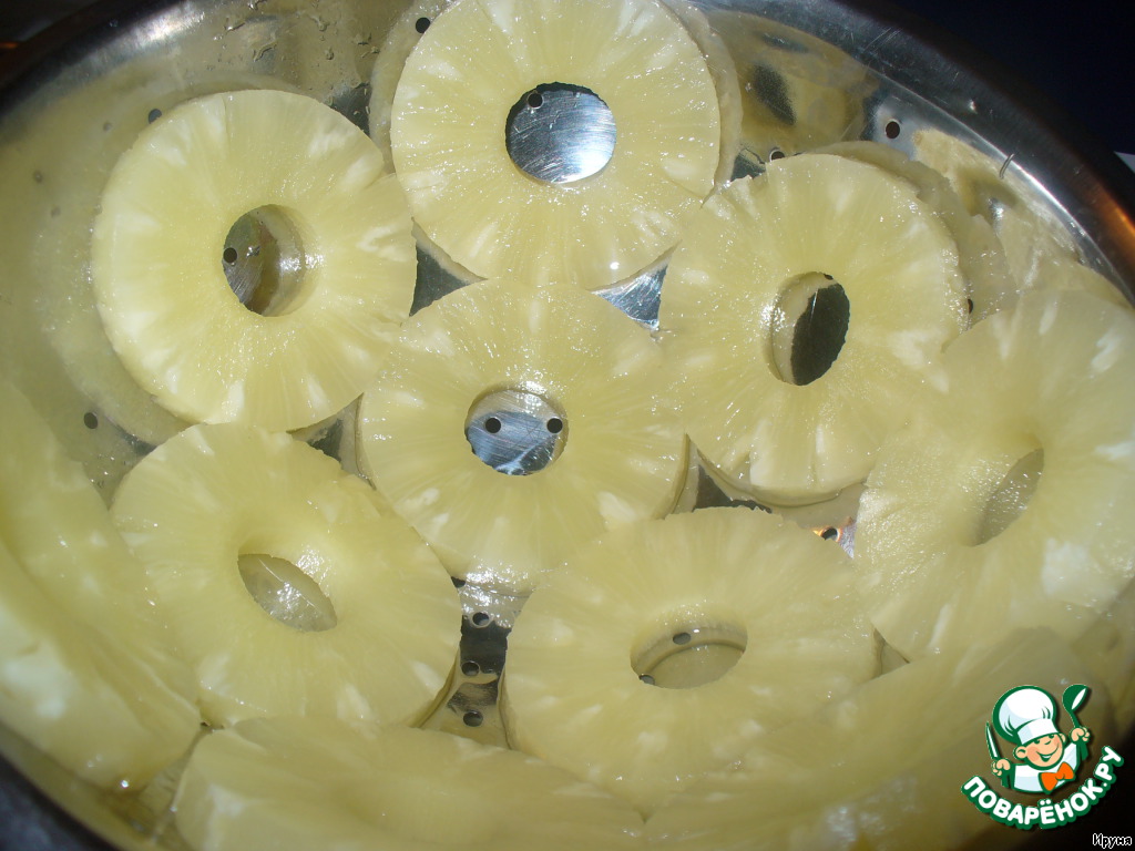 Кольца ананаса откинуть на дуршлаг и дать полностью стечь жидкости.