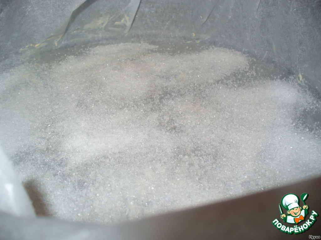 Разъемную форму (у меня диаметр 26 см) выстлать бумагой для выпечки, слегка смазать её сливочным маслом и равномерно посыпать оставшимися 2 ложками сахара.