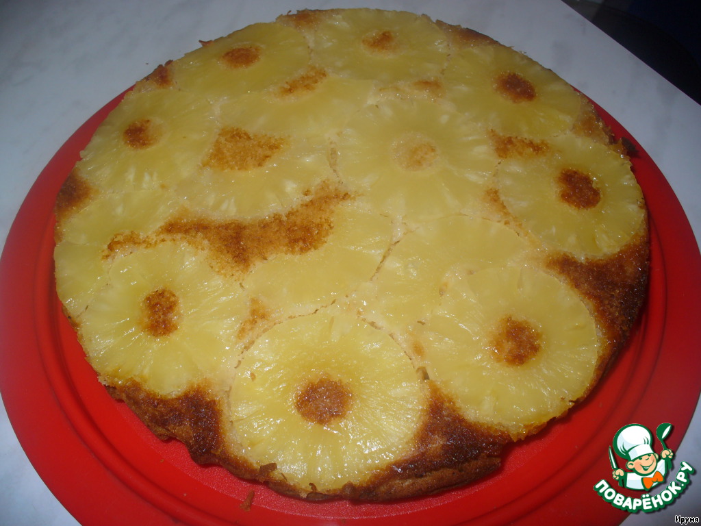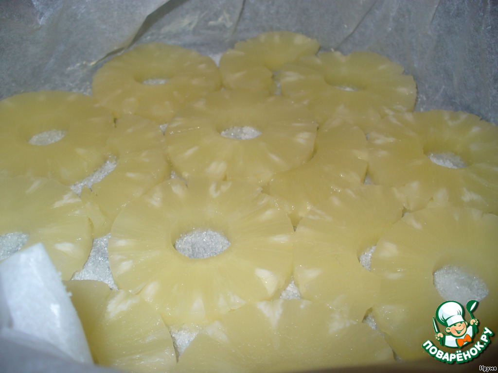 Сверху равномерно в 1 слой разложить кольца ананаса. У меня ушла полностью банка ананасов, 2 кольца разрезала пополам, чтобы заполнить пустоты.