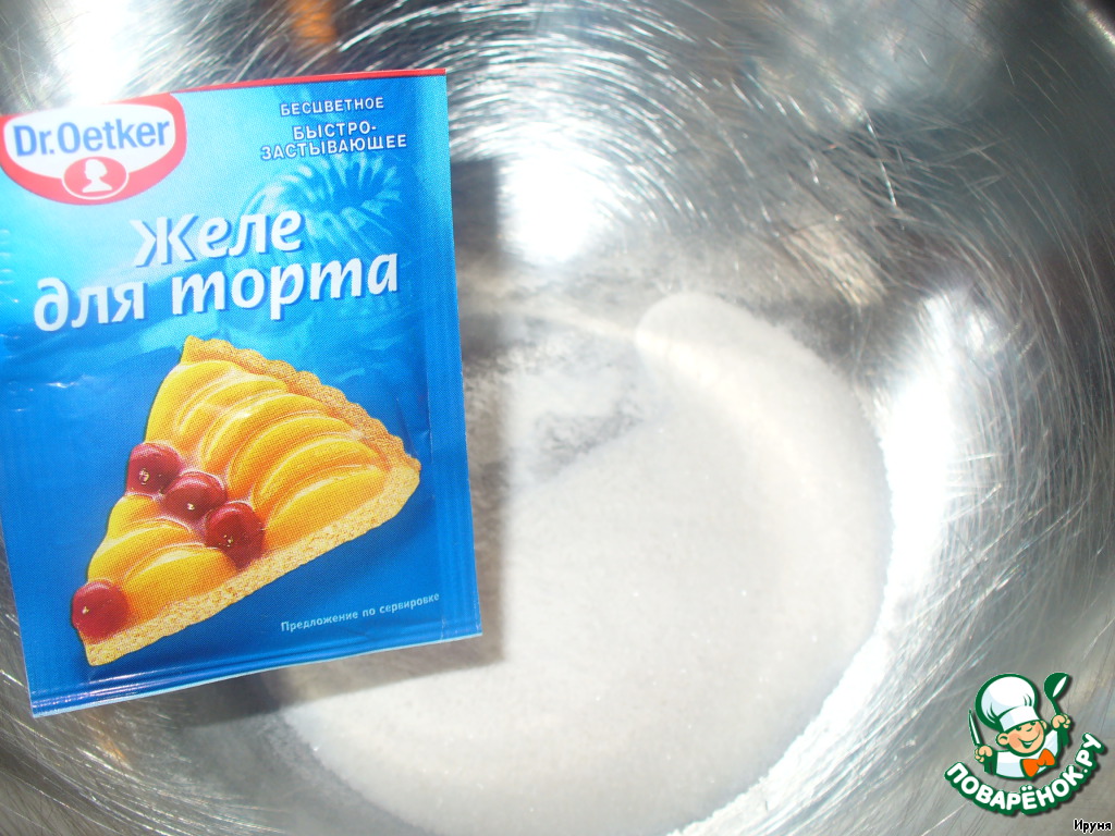 Теперь займемся заливкой. Нам понадобится пакетик готовой прозрачной заливки для торта. Нужно ориентироваться на инструкцию приготовления, указанную на упаковке!