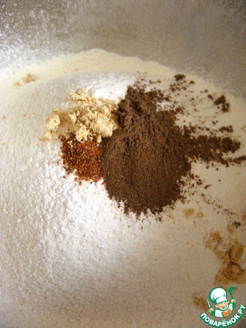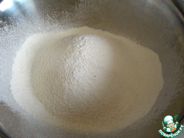 Оба вида муки просеять с разрыхлителем в миску.