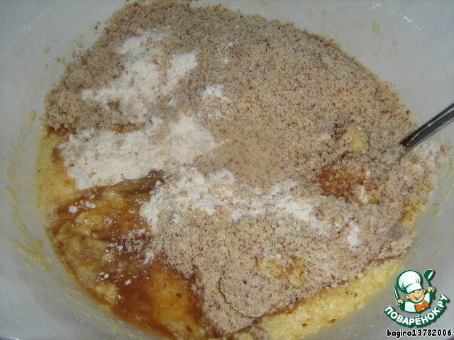 Затем всыпаем муку, миндаль, коньяк и все хорошо перемешиваем.