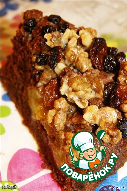 Быстренько смешать с орехами и равномерно выложить сверху на пирог, посыпать изюмом.