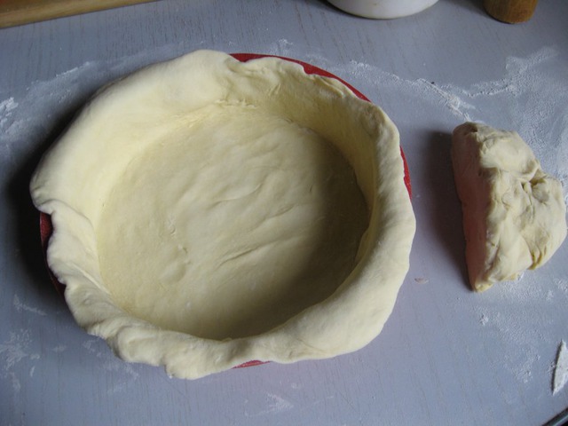 Тесто разделить на две части, примерно 1/4 отложить - это будет крышечка, а оставшееся тесто раскатать (не очень тонко, т.к. начинки получается много и дно может порваться) и уложить в форму
