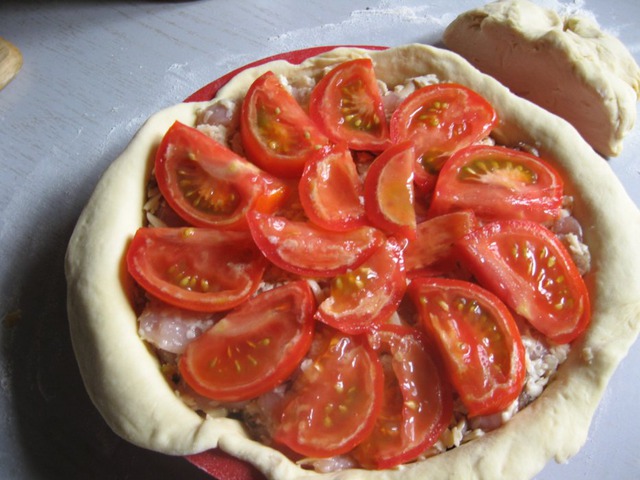 Помидоры порезать ломтиками и выложить сверху, края теста завернуть во внутрь и накрыть все это крышечкой