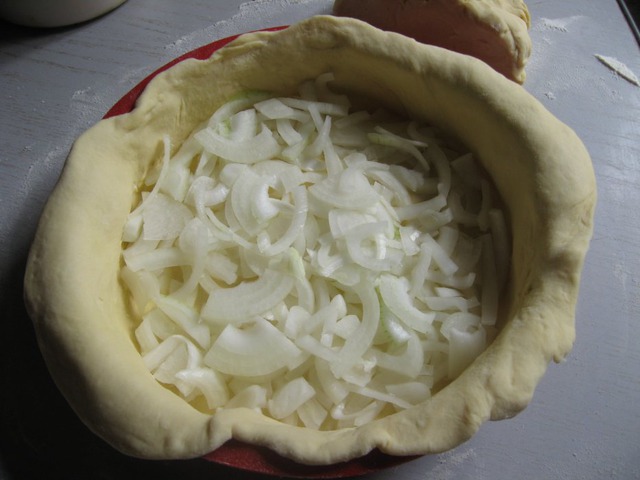 Лук порезать полукольцами и 1-ым слоем выложить на тесто
