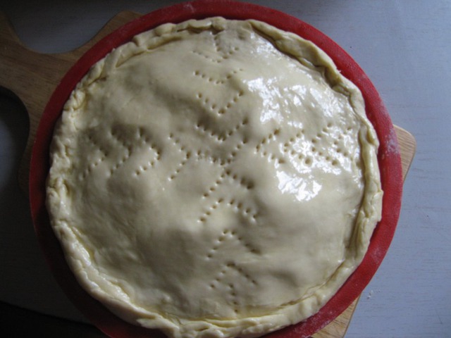 Края пирога защипнуть и обязательно сделать отверстие для выхода пара, т.к. иначе будет очень много сока! Я решила не делать и поплатилась за это:-|, дно моего пирожка размокло:-X, но на его вкусовые качества, к счастью, это не повлияло