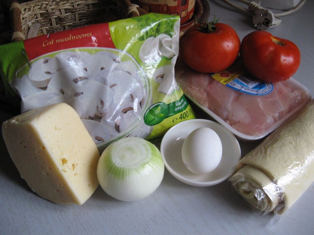 Подготовить грибы, куриное филе порезать на небольшие кусочки, сыр потереть на крупной терке, все смешать