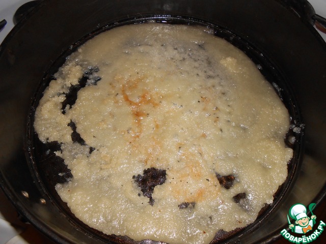 Как только станет местами темнеть карамель снимаем с огня и раскладываем лимон.