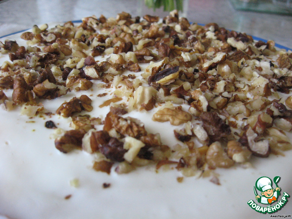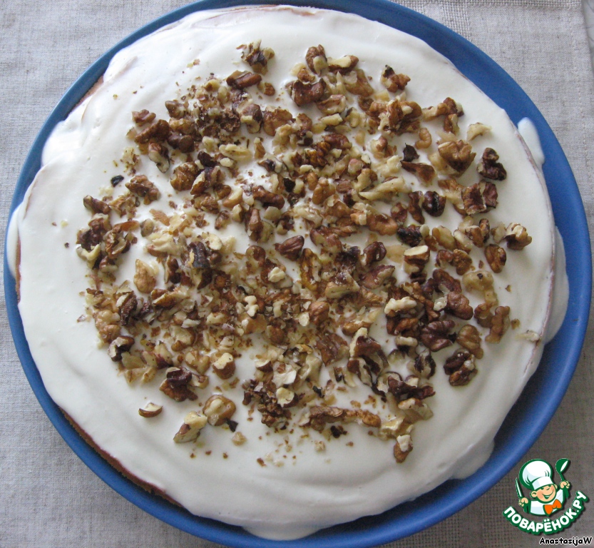 [i]Коржи промазать кремом и сверху торт посыпать орехами либо натертым шоколадом! Поставить в холодильник на 3-4 часа для того, чтобы торт пропитался. Лучше всего делать торт на ночь, тогда коржи пропитаются идеально![/i]