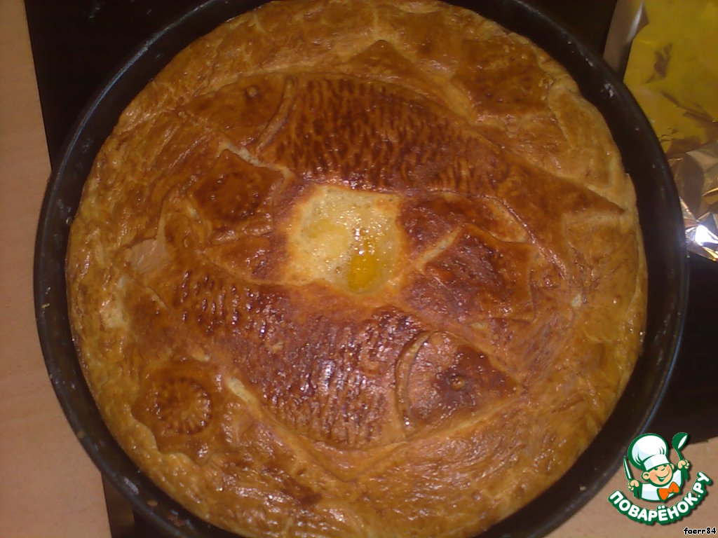 Закрываем тестом, по бокам делаем защипы и украшаем (я сделала рыбок). Отправляем в разогретую до 180*С духовку на 1 час.