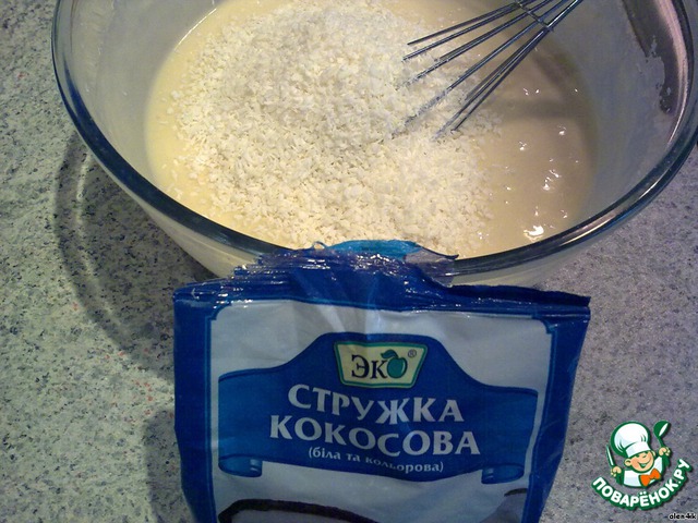 Добавить 40 гр кокосовой стружки (1 пакетик) и хорошо вымешать. Тесто готово (получается жидковатым)