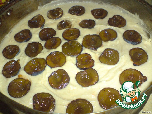 Хорошо вымешанное тесто вываливаем (оно получается не жидким) в промасленную форму. И сверху слегка придавливая втыкаем половинки слив.
