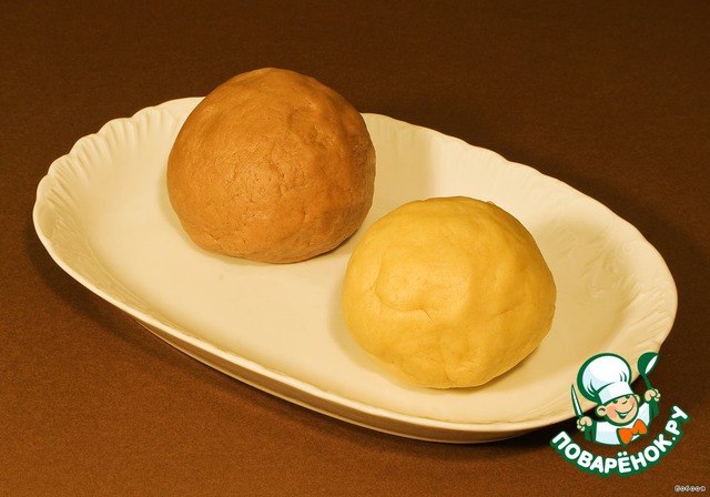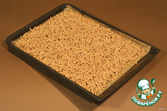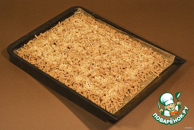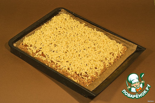 На противень укладываем промасленный пергамент и натераем темное тесто.
