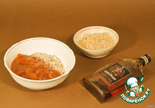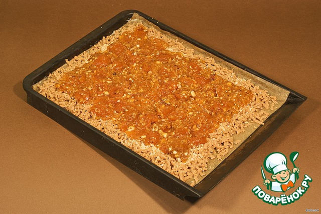 На противень выкладываем промасленный пергамент и натераем на терке темное тесто, которое сверху посыпаем оставшимся печеньем. Выкладываем начинку. Сверху опять натераем но уже светлое тесто. Подравниваем края и ставим в духовку на 30 мин. при температуре 180 -200 градусов.
