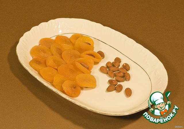 Вытаскиваем горячий пирог и сверху раскладываем начиненные орешком абрикосы-урюк. Из кондитерского мешка с наконечником белковым кремом оформляем поверхность пирога и еще ставим в духовку на 15 -20 минут до подрумянивания белка.