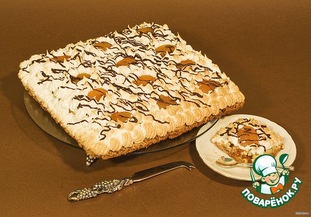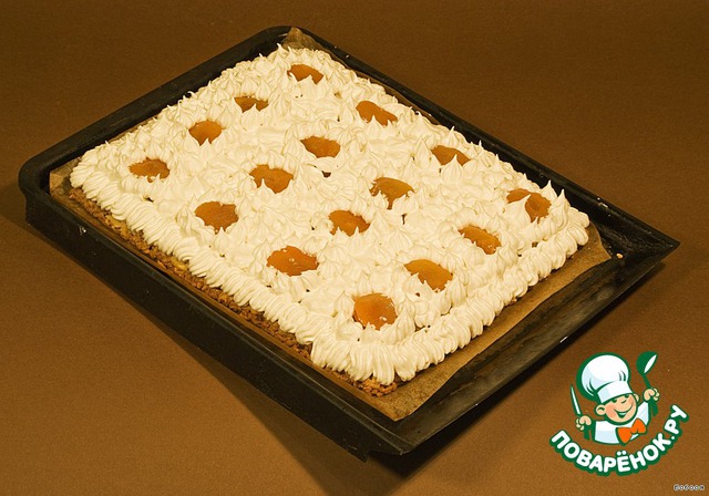 На горячую поверхность пирога выкладываем урюк и оформляем белковым кремом. Ставим еще на 15-20 минут в духовку до подрумянивания белка.