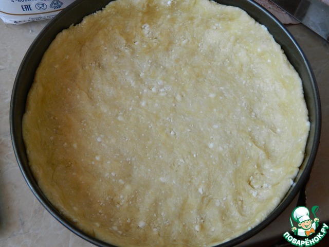 Выложить тесто в разъемную форму, сделав высокие бортики. У меня форма 24 см. И убрать его пока в холодильник.