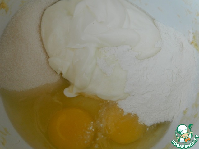 Для начинки смешиваем яйца, крахмал, сметану, сахар и ванилин.