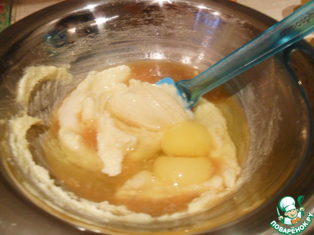 Добавить яйца, разрыхлитель теста и ром. Хорошенько вымесить. Если честно - для меня это первый опыт приготовления теста с алкоголем, но мне очень понравилось - довольно ощутимые нотки, а тесто получилось необычно пластичным и как будто воздушным... Конечно, желательно влить в тесто ром, но если его нет, а пирог испечь очень хочется - замените ром на хороший коньяк - тоже работает!