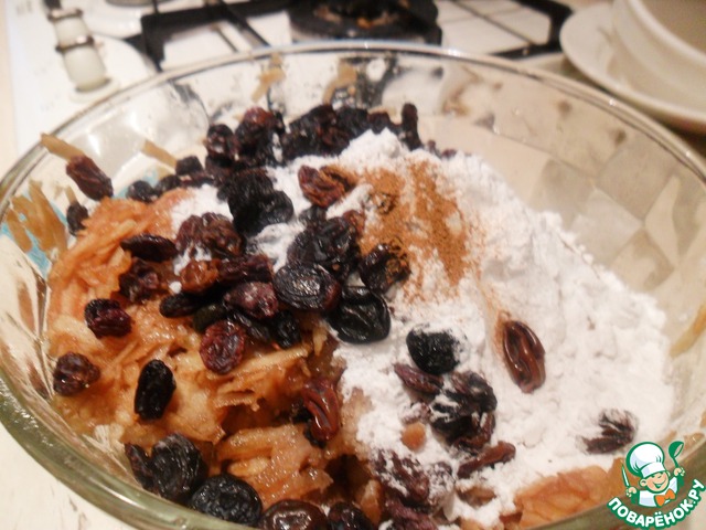 Добавьте изюм, крахмал и сахар (если яблоки сладкие - сахара возьмите поменьше, здесь сахар взят с рассчетом на кисло-сладкие яблоки). Добавьте щепотку корицы и перемешать (я делала это руками, как фарш).