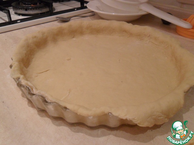 Достать тесто из холодильника и разделить на две части 2/3 и 1/3. Большую часть теста раскатать толщиной 5 мм и выложить в форму, сформировав бортики. (У меня форма 27 см в диаметре).