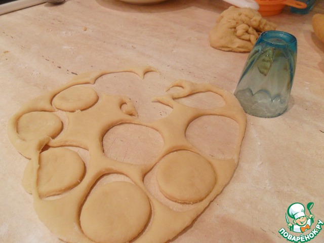 Оставшееся тесто раскатать в пласт чуть потоньше, чем первый. С помощью рюмки вырезать кружочки