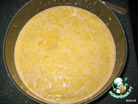 Вылить в форму половину теста,сверху аккуратно распределить лимонную начинку(оставить 1 ст. ложку для пропитки пирога).