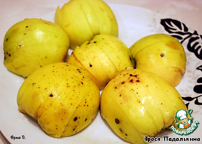 Для начинки: яблоки очистить (только сейчас это узнала, забыла, вот ведь..), удалить сердцевину, разрезать пополам. Каждую половинку надрезать не до конца тонкими ломтиками.