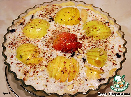 Разогреть духовку до 180 гр. Тесто раскатать, форму смазать сливочным маслом, выложить тесто, сформировав бортик. Выпекать 15 минут, затем форму вынуть из духовки.