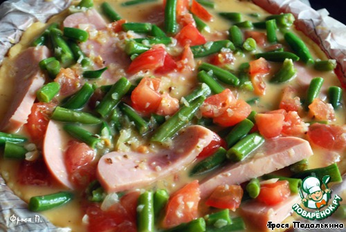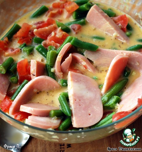 Яйца взбить, добавить тимьян, соль и перец по вкусу. Смешать с фасолью, ветчиной, луком и помидорами.