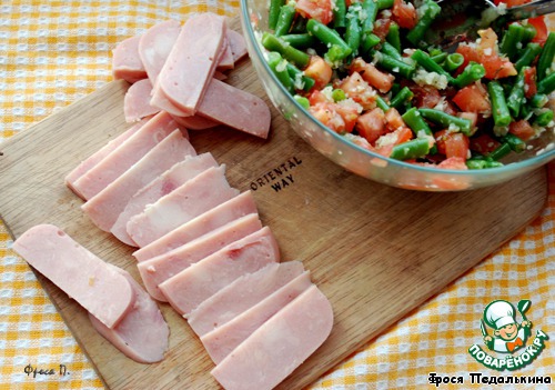 Лук и чеснок измельчить, обжарить в оливковом масле. Помидоры обдать кипятком, снять кожицу, порезать кубиками. Ветчину нарезать ломтиками.