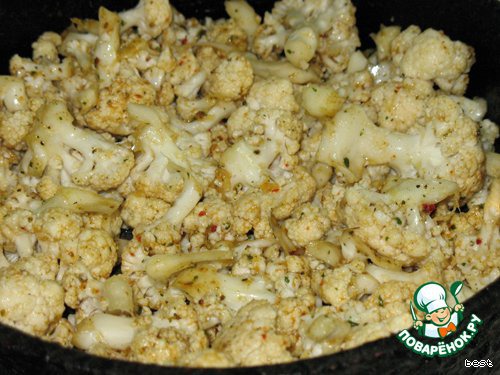 Цветную капусту вымыть и разобрать по соцветиям. Положить её в миску, побрызгать растительным маслом и посыпать специями. Приправить солью и измельчённым чесноком (2 зубчиками), тщательно перемешать.