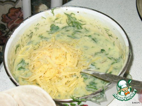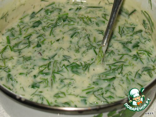 Добавить в соус тертый твердый сыр, измельчённые 2 дольки чеснока, зелень. Когда немного остынет, добавить 2 взбитых яйца. Приправить солью и перцем.