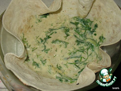 Точно так же поступить со второй половинкой лаваша: намазать и уложить в форму.