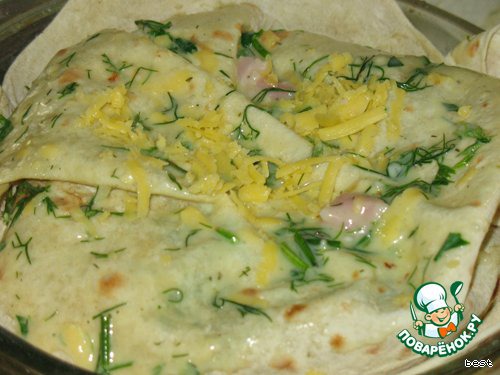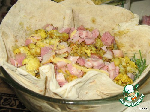 Начинку (капуста и порезанная кубиками ветчина) выложить в форму. Залить соусом (оставить несколько ложечек для верха) и закрыть сверху свисающими концами верхнего листа лаваша.