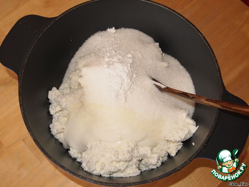 И сделаем начинку из творога. Берем творог (700-800 гр), добавляем сметану 3-5 ст.л., сахар 1 и 1/4 стакана и ванильный сахар 1 ч.л. (если ваниль, то на кончике ножа).