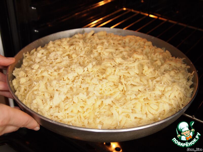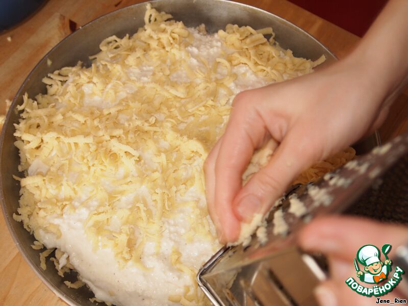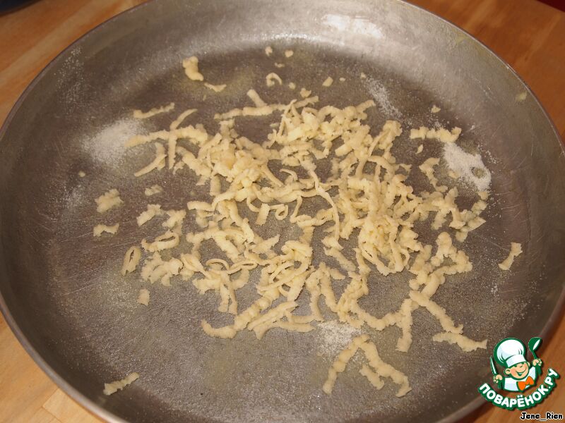 Теперь достаем по кусочку тесто из морозилки и натираем на крупной терке бОльшую часть теста (2/3) прямо на сковороду.