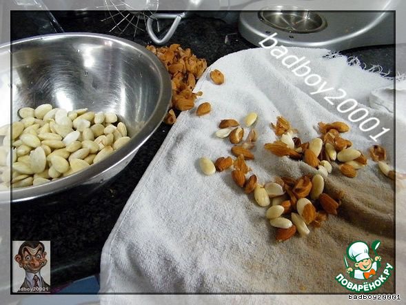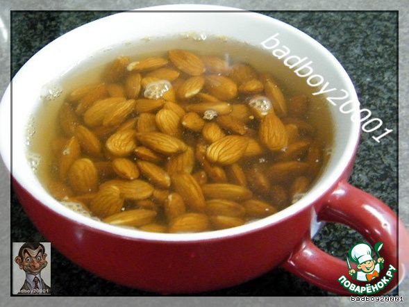 Миндаль залейте кипятком, и дайте постоять четверть часа,