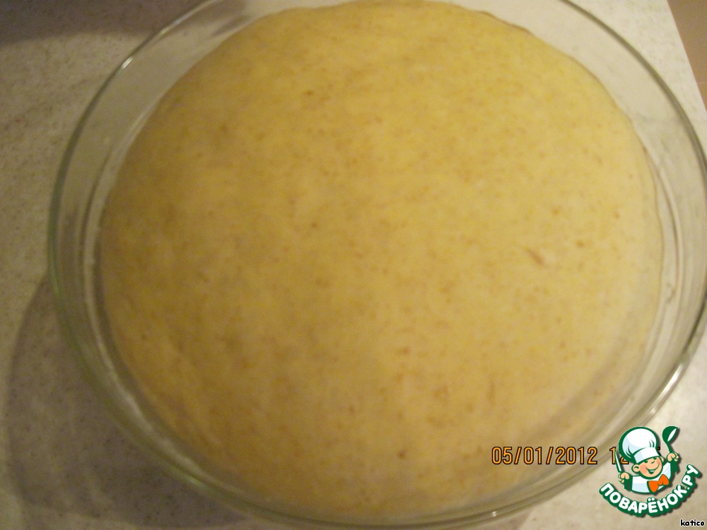 Полученную смесь добавляем к муке, туда же добавляем растопленное или очень мягкое сливочное масло. Замесить тесто, если надо, добавляем еще муки, пока тесто не перестанет липнуть к рукам, не делайте тесто очень крутым, оно должно быть легким и мягким.