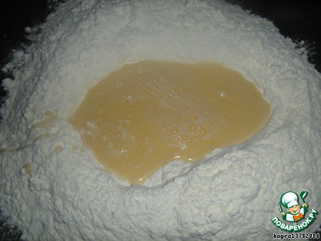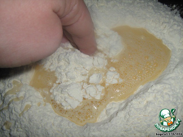 Затем, пальцами, начинаем замешивать тесто, подбирая муку от краев и смешивая ее с жидкостью. В процессе замеса используем всю жидкость, подливая ее по мере надобности. Муки может потребоваться больше/меньше.