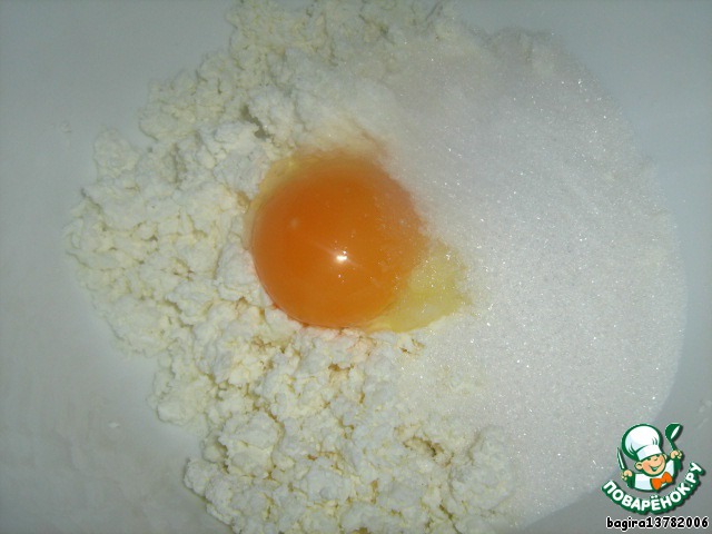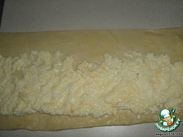 В это время готовим творожную начинку: хорошо растираем творог, яйцо и сахар. По вкусу добавляем ванилин.