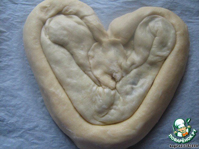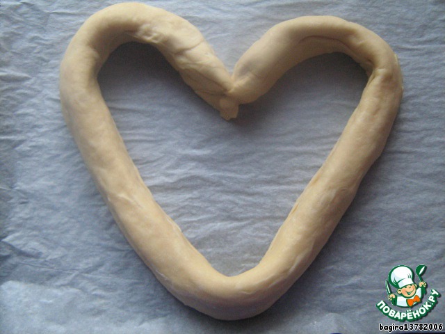 В середину сердца выкладываем второй рулет, и слегка прижимаем его к первому, чтобы они соприкасались друг с другом.