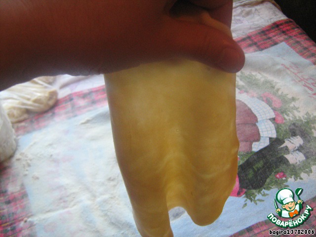Так, аккуратно растягивая и вытягивая, поступаем со всеми кусочками теста.