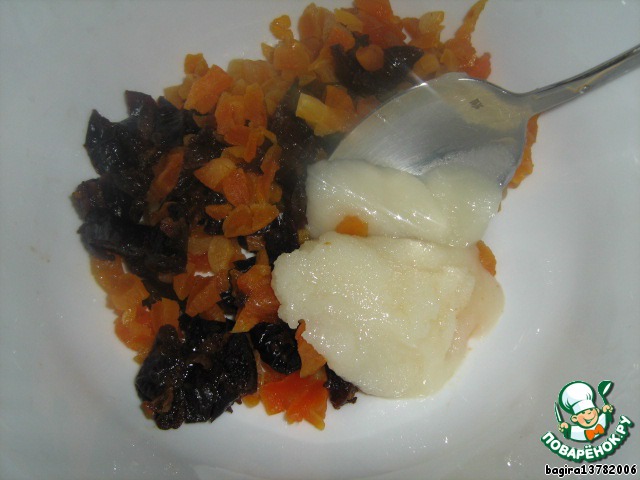Сливаем воду с сухофруктов, мелко их нарезаем и смешиваем с медом.