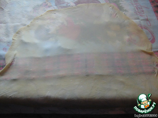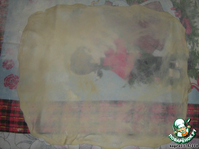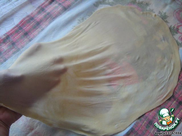 Растягивать тесто нужно как можно тоньше - оно должно просвечивать и быть очень тоненьким.